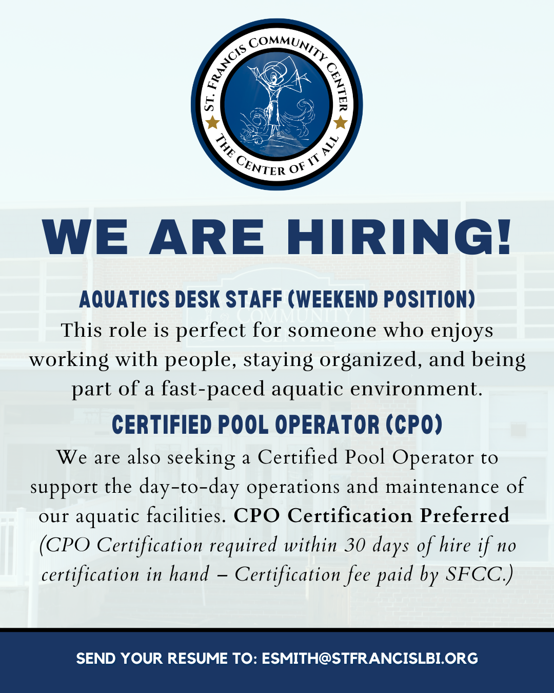 Dive into fun and fitness at St. Francis Community Center! With an indoor pool for year-round enjoyment and two outdoor pools for summer fun, our aquatics programs offer something for everyone. From swim lessons and water aerobics to open swim sessions, we provide a safe and welcoming environment for all ages and skill levels.